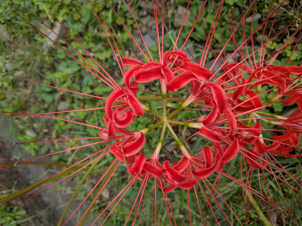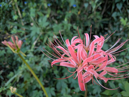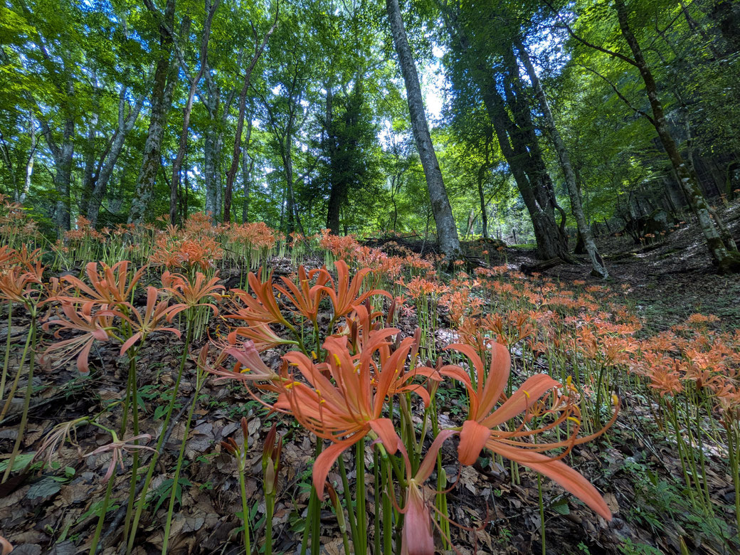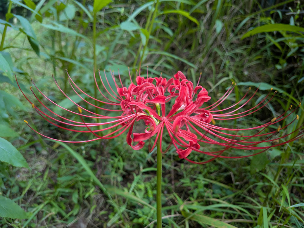 細い葉がカミソリに似て、オレンジ色がキツネに似てるし 葉が無くていきなり花が咲く様子がキツネに騙されてるみたいだからこの名前。花期は8月中旬~下旬、今日は咲始めで見事な景色。仲間のヒガンバナはお彼岸の時に咲き、オオキツネノカミソリはお盆に咲く。🚩ウニパスタ・シシャモ・ブロッコリー卵サラダ・ブドウ