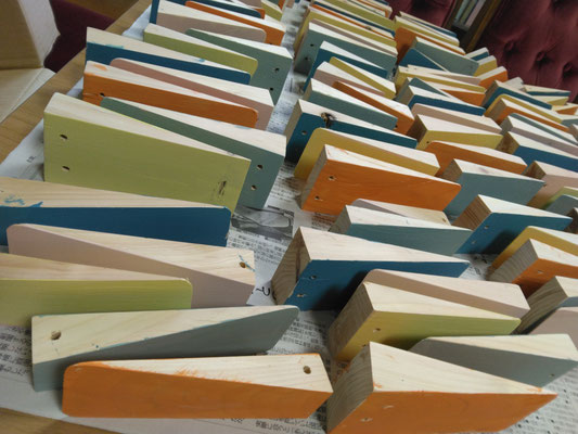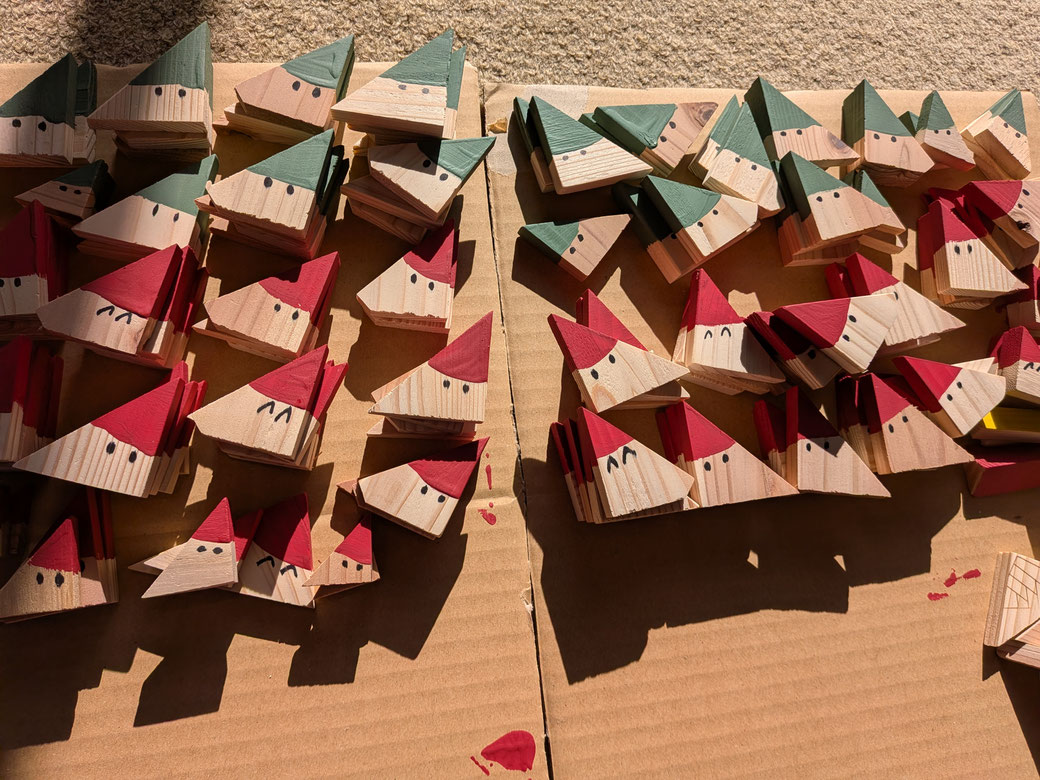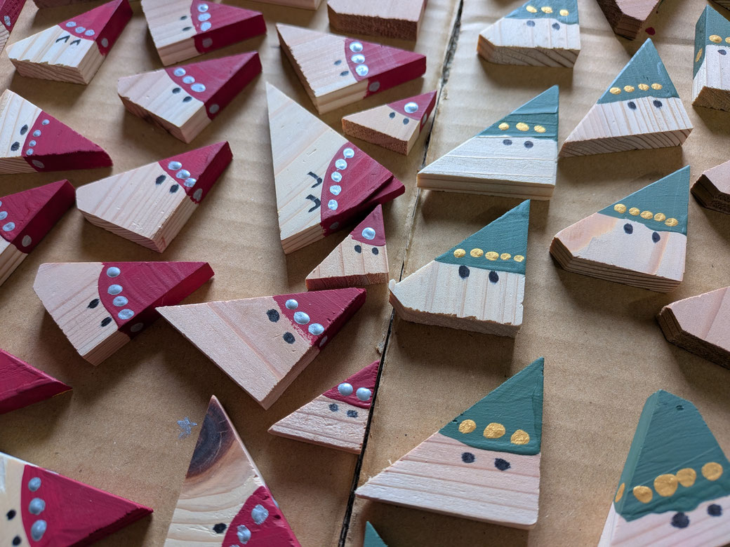 三角の木っ端があったので子供が好きな色をクリスマスカラーで塗ろう、と思いペンキを買ってきて着色。華やかさに欠けると、金銀のペンキも購入し点々をつけてみた。こんな作業が結構好きだけど、独りでやるのは退屈。