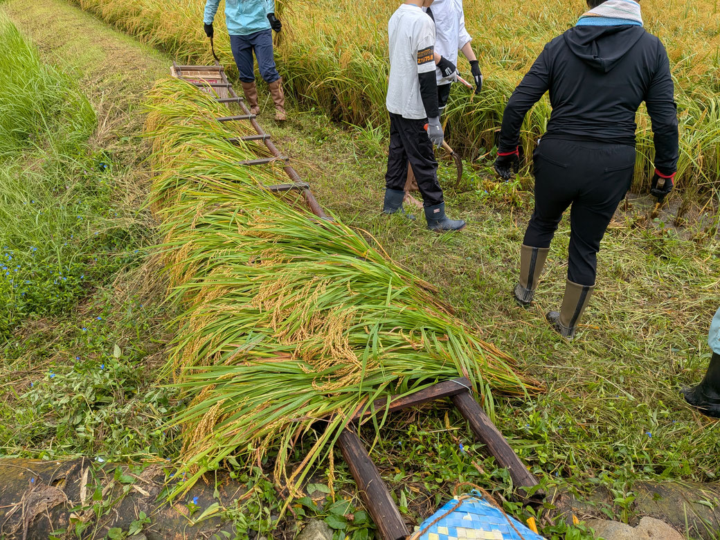 前日から何度も天気予報をみて、農家さんと相談して心配したけど、奇跡的に作業の間は雨が止んだ。大人も子供もザクッと鎌で刈る音や手応えを楽しみ、この束一つでご飯一杯になる?この田んぼを昔の人は手刈りどれくらいの作業時間でやったの?ご飯は一粒も無駄にしちゃダメだね!など色々と感じた様で嬉しかった。新米が楽しみだな~。