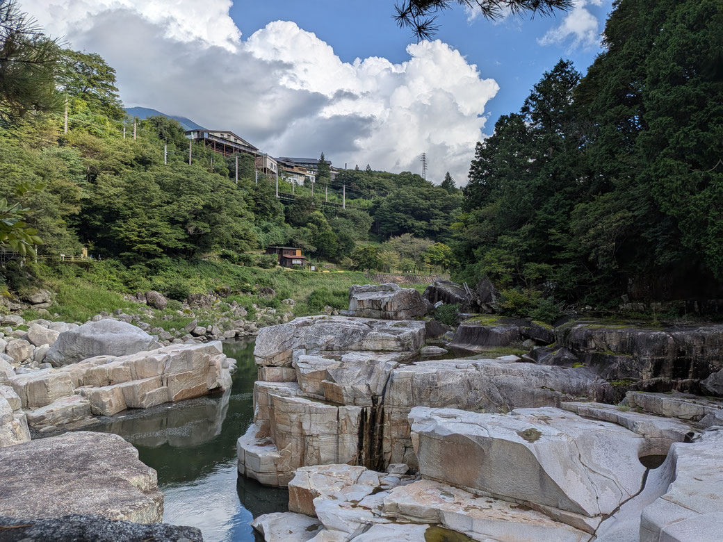 今日は皆で山歩。滝壺や淵の薄水色に感動しながら登り、目的地の夫婦滝で昼食。下山すると雨が降り出し アッと言う間に土砂降り、川は恐ろしい音を立てて土砂が流れ 雨具を着ても汗で濡れ、無事 登山口に着いたらスッカリ体は冷えていた。雨具を着て土砂降りの木道を黙々と歩くのは楽しかったけど、鳴り響く雷は怖かった。。