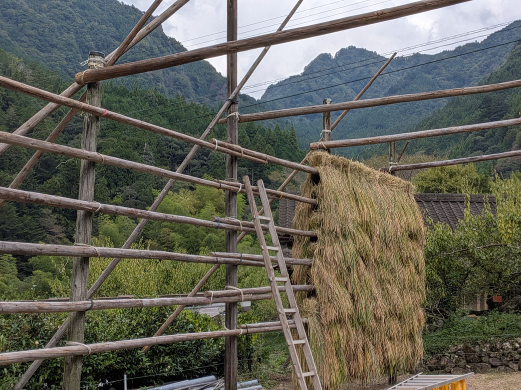 六段のはざかけを奥三河で見つけた。約2週間 逆さにすることで藁の栄養を籾へ落とし 天日で乾燥すると甘味が増える、更に昔は藁から外した籾付きのお米を庭先に広げたむしろの上で更に2週間干すと熟成されて旨味が増す。いつかそこまでやってみたいと思うのは、素人の考え。昔の人は美味しい物を食べる為に手間暇かけて凄いな。